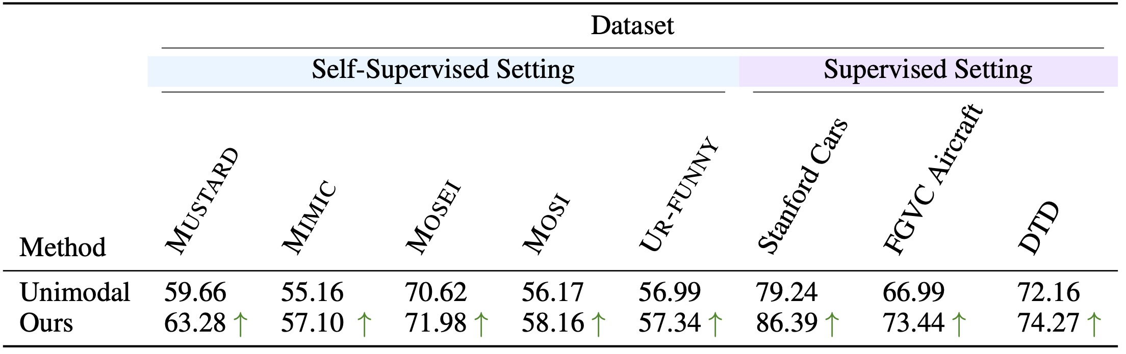 multimodal benchmarks from MultiBench dataset; (b) in supervised setting