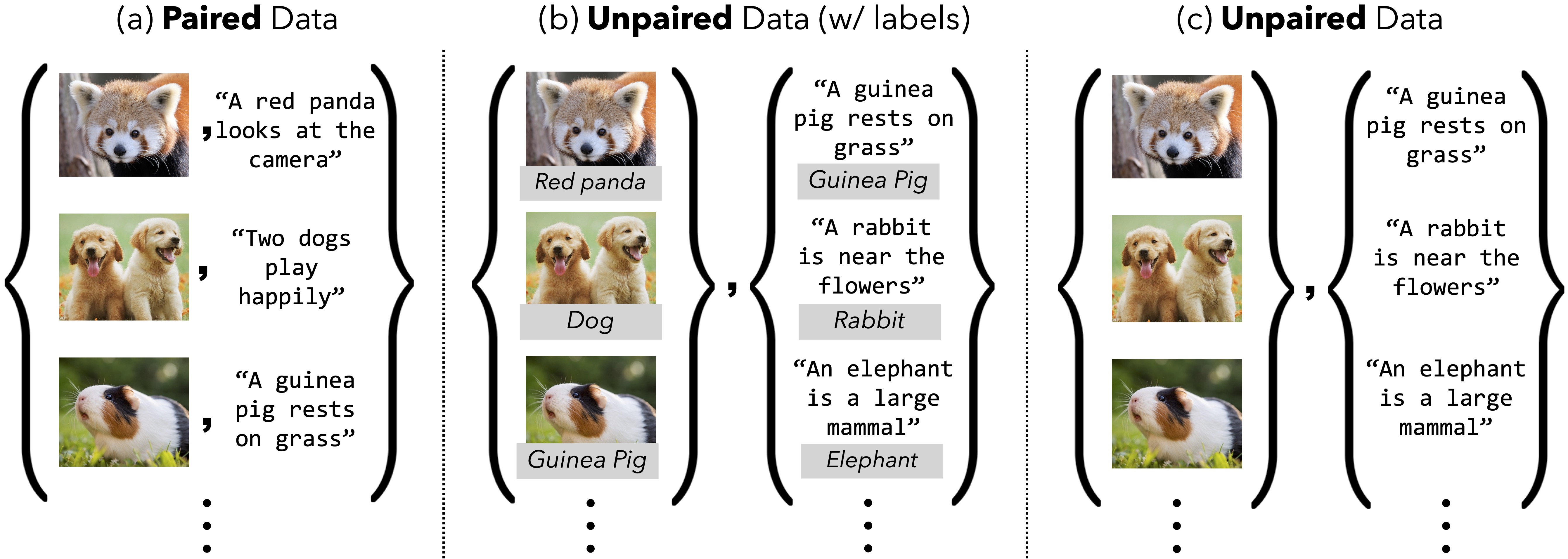 We examine two regimes of unpaired data: (a) with labels where data from each modality
