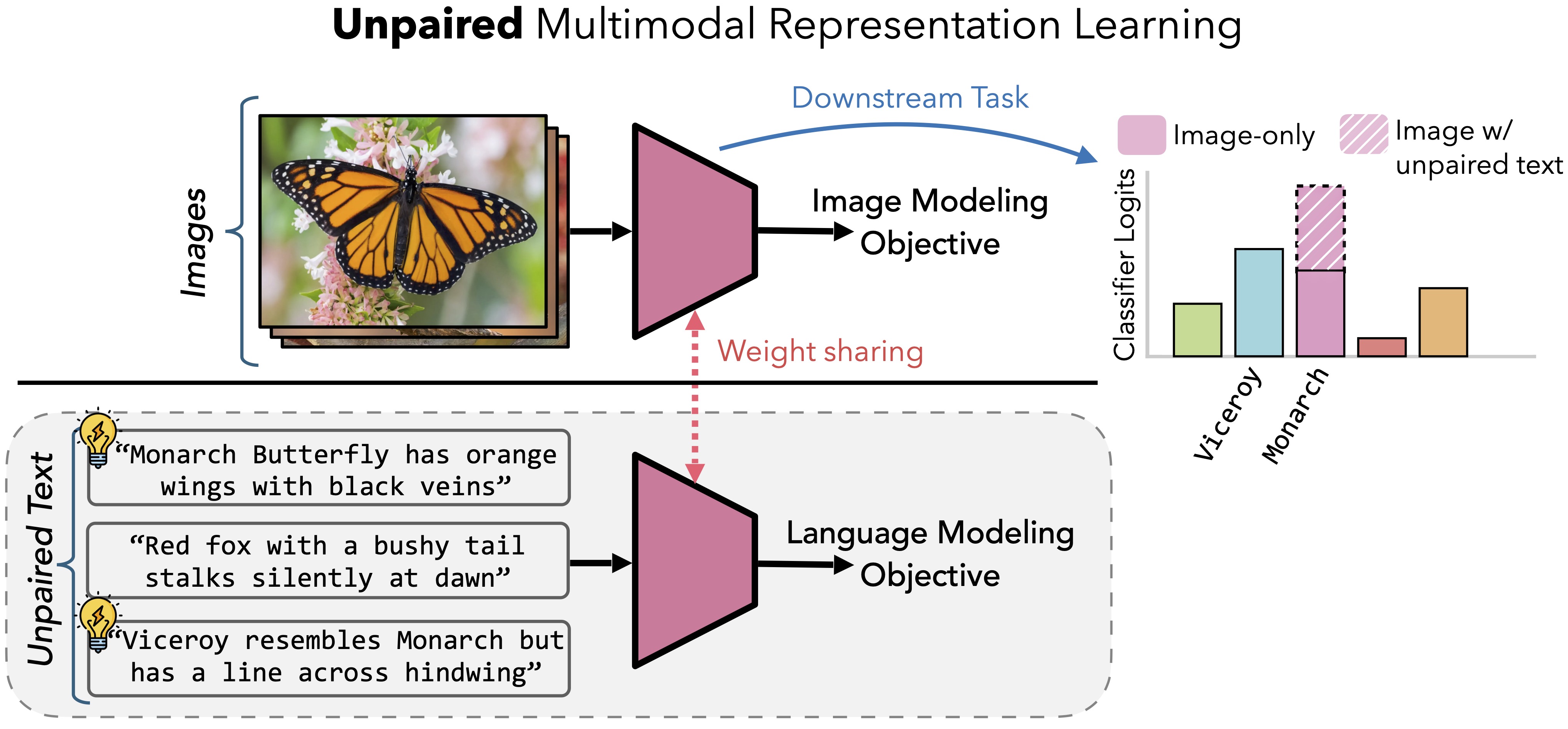 We introduce Unpaired Multimodal Learner (UML) whereby sharing model weights across modalities